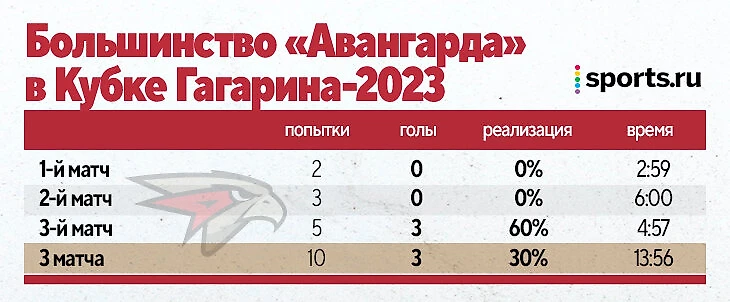 У Новосибирска в этот вечер тоже работало большинство, но не так, как игрокам хотелось бы: 2 гола с 8 попыток. Хотя в целом «Сибири» не нужны были неравные составы – и без этого они доминировали в чужой зоне. Всего в сторону ворот Демченко они бросили 93 раза: 37 дошло до створа, 24 – в молоко, а 32 – заблокировали хоккеисты «Авангарда»!