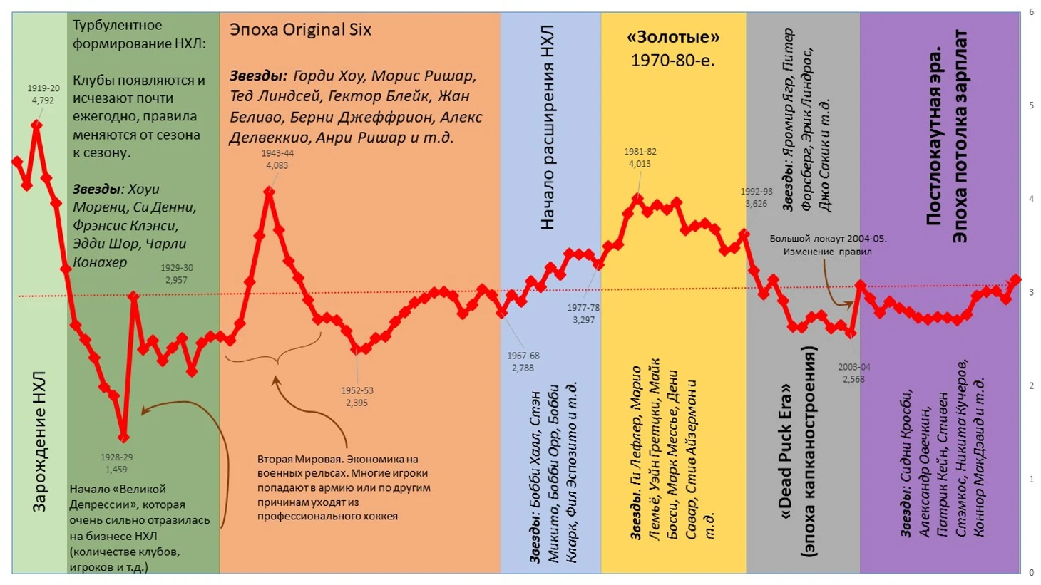 Уравняв все команды внутри отдельно взятого сезона, мы теперь уравниваем все сезоны в истории НХЛ, приводя эту историю к одной линейной функции. Если не углубляться во всю эту математику, то средняя результативность НХЛ за всю её историю составляла 3,025 гола за игру. Поскольку, как я написал выше, критерий Фишера для линейной функции в достаточной степени низкий, в файле ниже я, основываясь на графике средней результативности, на который я нанес "исторические эпохи" (см. выше) разделил эту историю на четыре условно независимых линейных функции. Это, конечно, не полиноминальная функция четырех степеней, но это дает чуть более достоверный результат в исторической перспективе, правда... Не позволяет использовать полученную модель "в лоб" - вы получите четыре различных "статистически уравненных" периода для каждого сравниваемого игрока, приведя их "сослагательную" результативность к конкретному историческому периоду (т.е. "что бы было, если бы Гретцки и Овечкин играли в эпоху Original Six" vs. "что бы было, если бы Гретцки и Овечкин играли в эпоху до Original Six"). В файле ниже вы можете с этим поиграть, может придумаете, как это можно использовать для повышения достоверности всей исторической математической модели, а я пока продолжу рассказ на основе линейной функции, распространенной на всю историю НХЛ.