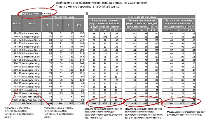 По сути она делает расчёт в два этапа. На первом этапе она для каждого игрока в проведенном сезоне усредняет его результативность относительно результативности отдельно взятого сезона, а затем полученный показатель усредняет относительно результативности за всю историю НХЛ.