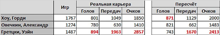 Иными словами, Гретцки, за счёт того, что играл в команде, результативность которой в свои годы с точки зрения классического гауссова распределения, являлась статистически недостоверной, причём в годы, когда результативность НХЛ в целом была на одном из самых высоких уровней в своей истории не досчитался около 150 голов. В то время как Хоу и Овечкин из-за того, что играли в годы, когда результативность Лиги в целом была ниже исторически средней, наоборот, "приросли" 40-70 голами.