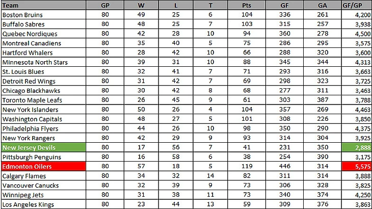 Из этой таблицы видно, что результативность Эдмонтона в том сезоне была 5,575 голов за игру, в то время как Нью-Джерси (да-да, "Команда Микки Маусов") забивали только 2,888 голов за игру.