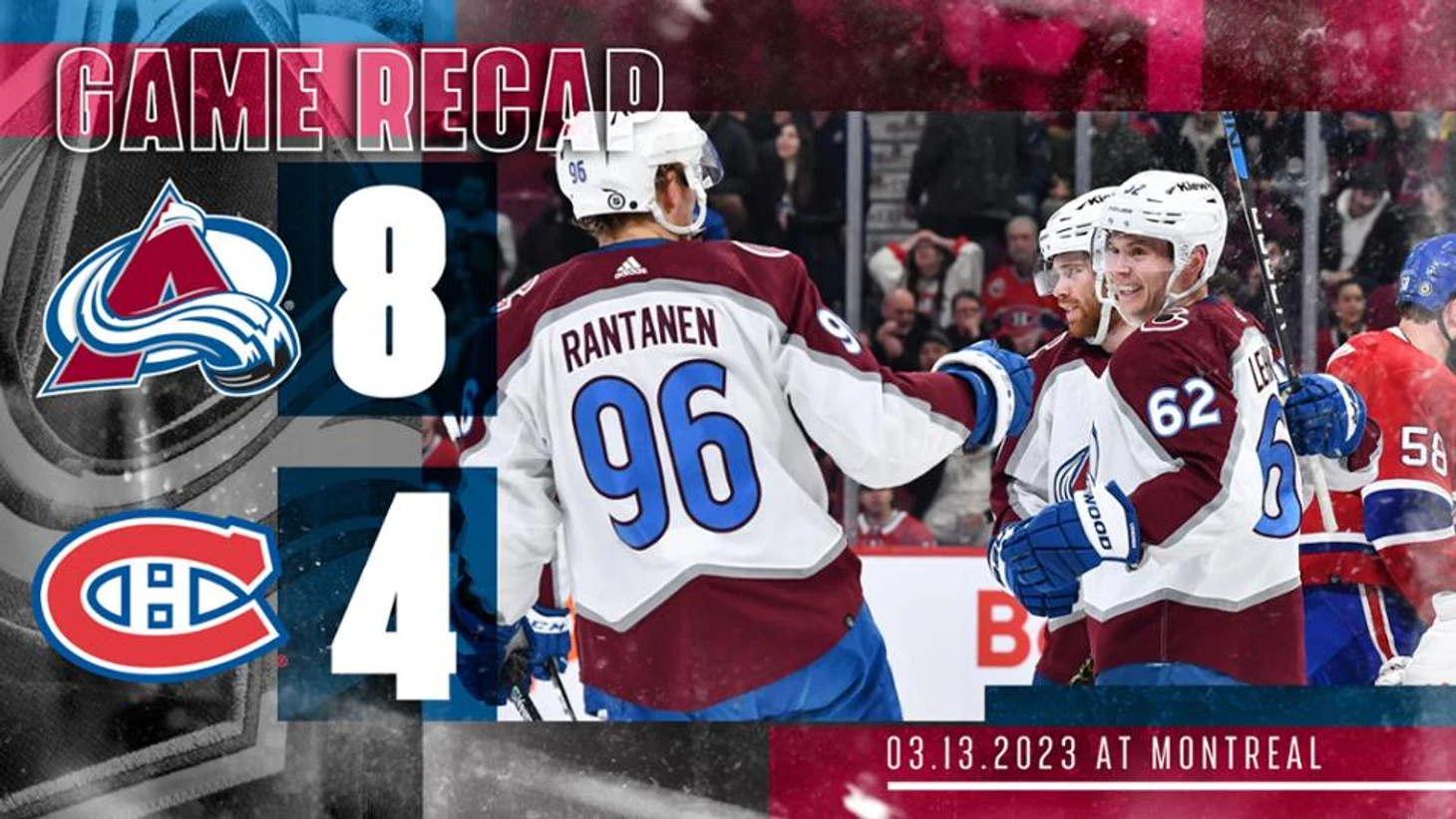 "Монреаль Канадиенс"-"Колорадо Эвеланш" 4:8.Арттури Лехконен набрал 3 очка (2+1),Валерий Ничушкин также набрал 3 очка (1+2),Кейл Макар отдал 3 результативные передачи,Натан МакКиннон и Микко Рантанен набрали по 2 очка (1+1),Лайам О'Коннор и Дэвон Тэйвз отдали по 2 результативыне передачи,Александр Георгиев отразил 15 бросков.У хозяев Джош Андерсон набрал 2 очка (1+1),Ник Сузуки отдал 2 результативные передачи,Денис Гурьянов забросил одну шайбу.В 3 периоде Майкл Пеццетта подрался с Боуэном Бирамом.