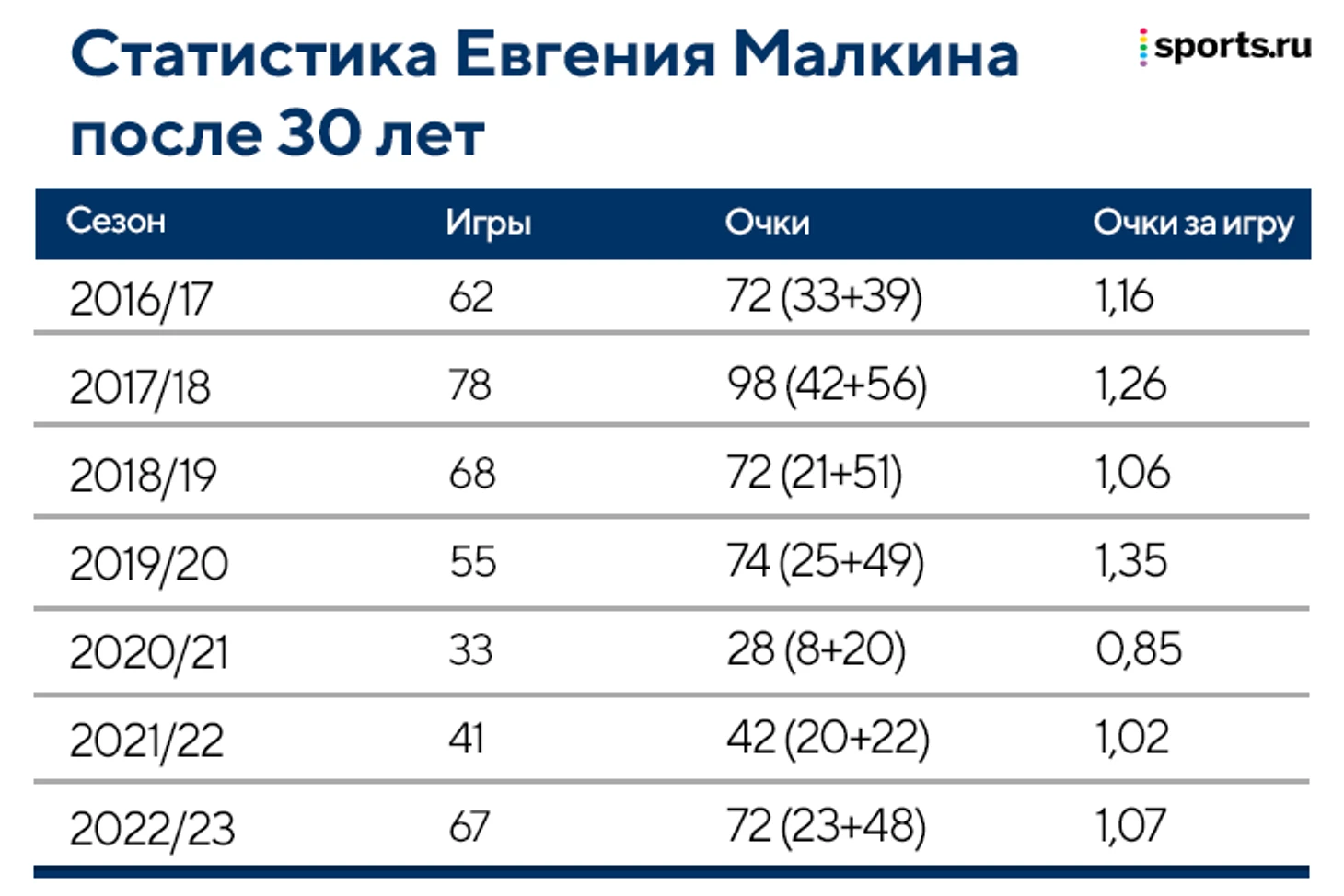При этом после 30 Малкин совсем не сбавил в результативности. Сокращенный сезон-2020/21 был единственным, когда он набирал меньше очка за игру. К тому же, тогда он пропустил часть регулярки из-за травмы.