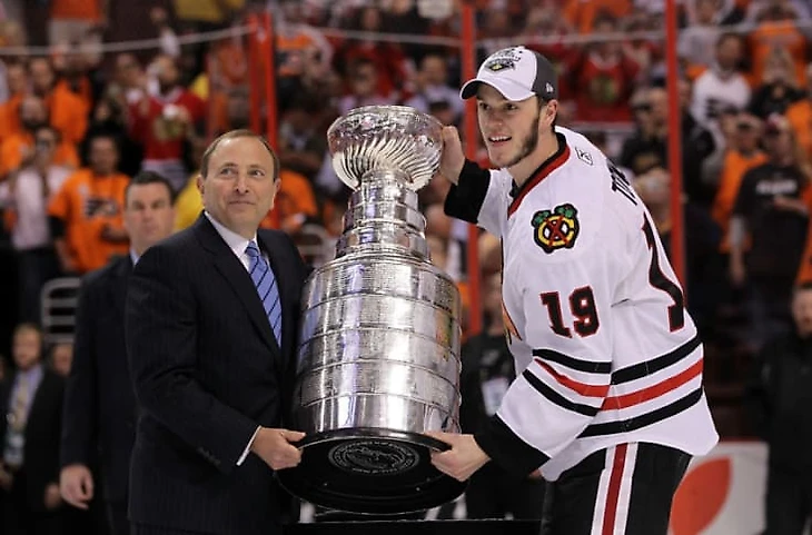Разумеется, сезон 2007-08 Джонатан начал в основе «Чикаго». Летом того года «ястребы» взяли с драфта ещё и Патрика Кейна, так что на новый дуэт были большие надежды. Напомним, что Тейвз забил своим первым броском в первой же смене в НХЛ. Об этом мы даже рассказывали в отдельном ролике, советуем посмотреть его здесь. Два года ушли на раскачку и построение команды, а в сезоне 2009-10 «Чикаго» во главе с Тейвзом взял первый Кубок Стенли. Причём мы говорим «во главе с Тейвзом» не только потому что он уже капитанил в клубе на тот момент. В плей-офф победного сезона Джонатан набрал 29 очков в 22 матчах, став лучшим бомбардиром клуба и заслужив Конн Смайт Трофи – приз самому ценному игроку плей-офф. Тогда Джонатану только-только исполнилось 22 года. Кстати, не забыли, что ещё было в 2010 году? Верно, домашняя для канадцев Олимпиада. Ярче всего в памяти, конечно, отпечатался победный гол Кросби в овертайме, но Тейвз на том турнире тоже был – набрал 8 очков за 7 матчей, тоже забрасывал американцам в финале и в отличие от Сида стал лучшим нападающим турнира. Джонатан Тейвз выиграл и Кубок Стенли и Олимпиаду в один сезон, такое удавалось только 8 игрокам в истории. Джонатан Тейвз вошёл в тройной золотой клуб и стал самым молодым игроком, удостоенным этого. Ах да, ну и обложка НХЛ 11 в придачу. В 2010 году Джонатан Тейвз был, пожалуй, лучшим игроком мира здесь и сейчас. И не забывайте, что всё это он сделал, находясь на контракте новичка.