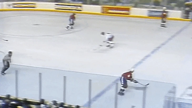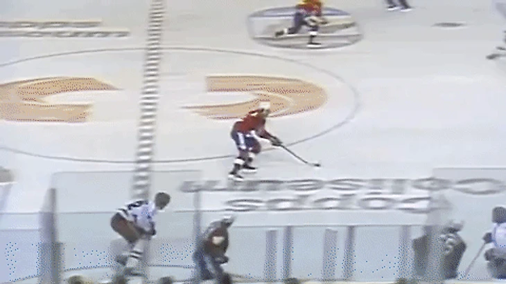 На лед вышла тройка Ларионова, отметившаяся двумя шайбами в большинстве в первом периоде первого матча, и тут же заперла канадцев в зоне на целую минуту, но забить не смогла. Гилмор уже готов был вернуться в игру, когда Гретцки перехватил передачу на синей линии, прошел среднюю зону и нашел неукротимого Рошфора, решившего вновь подключиться в атаку.