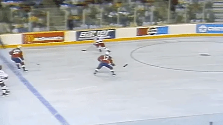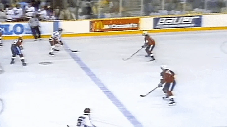 В результате получился вполне классический выход 2-в-2, однако Коффи, перепрыгнувший бортик вскоре после Гартнера, устремился в свободное пространство догоняющим. Гретцки, которого частично накрыли, увидел это быстрее всех на арене и показал в сторону Коффи клюшкой. Гартнер не понял намека, но его передаче на Гретцки не сумел помешать Стельнов, а Великий перевел шайбу на Коффи, летевшего по центру без опеки. Защитник «Ойлерс» принимал пас, не сбавляя скорости, здорово ушел влево и переиграл Белошейкина, упрочив преимущество Канады до 3:1.