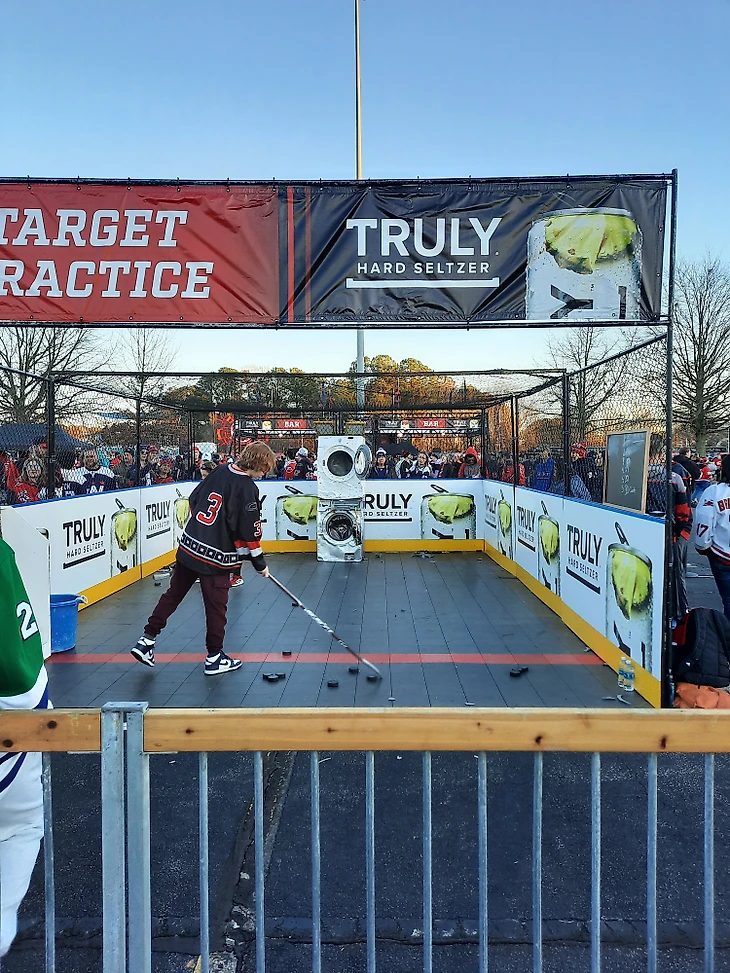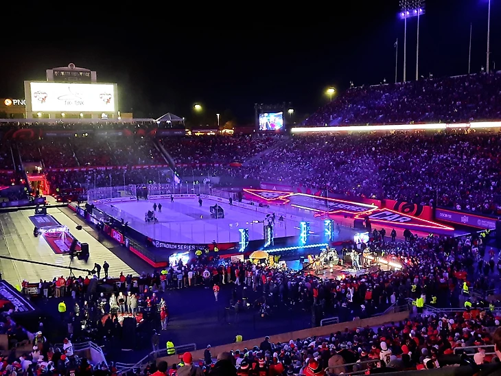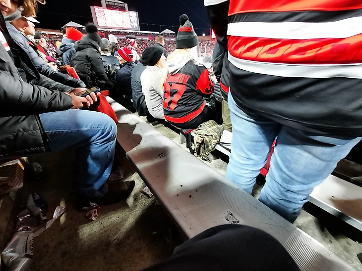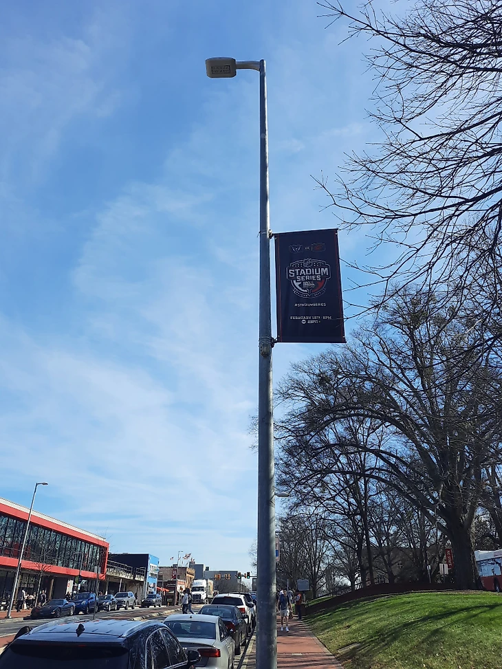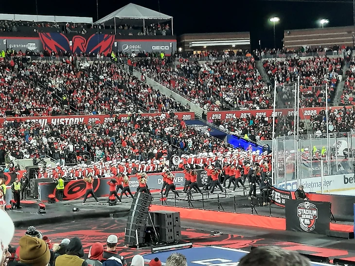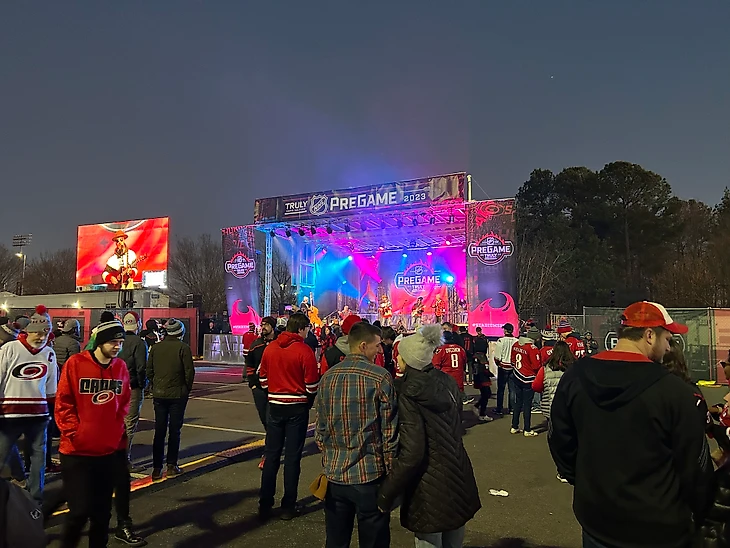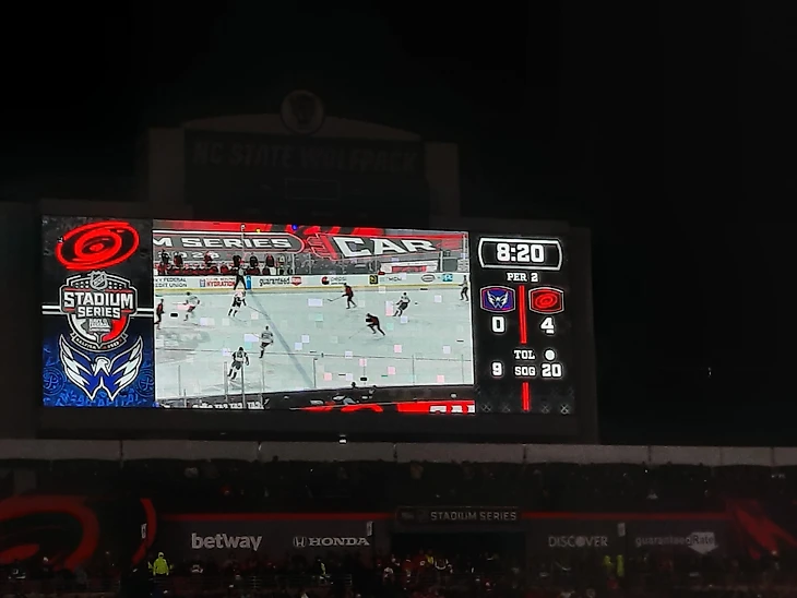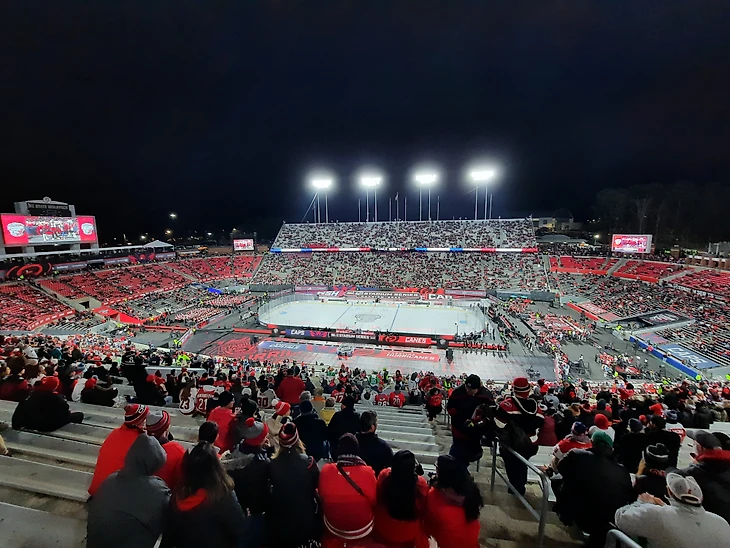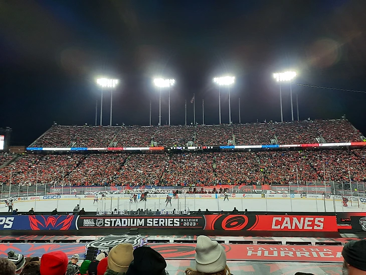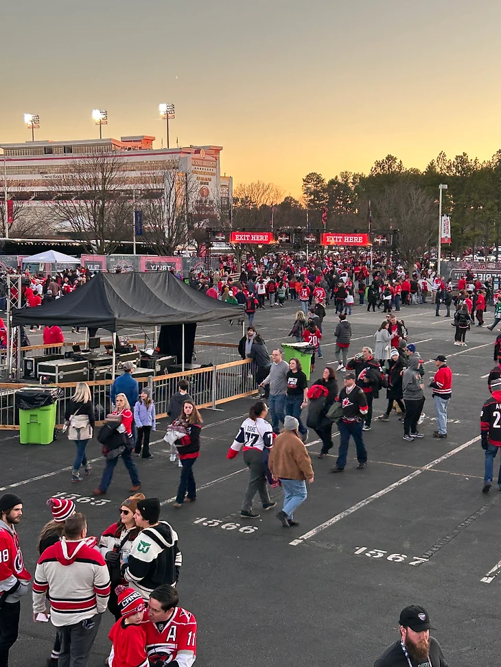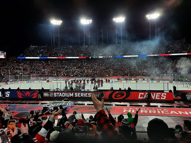 Крупнейшее спортивное событие в истории Роли Изначально НХЛ хотела провести Стадионную серию в Северной Каролине ещё в 2021, но из-за ковида ожидание затянулось на два года. Поэтому неудивительно, что билеты на игру почти поставили рекорд по скорости продажи. Я свой урвал ещё в сентябре и пять месяцев предвосхищал это историческое событие. Местом встречи выбрали футбольный стадион Картер-Финли, который находится буквально через дорогу от обычной арены «Харрикейнс». Это домашний стадион университетской команды по американскому футболу «Северная Каролина Стейт», о походе на матч которых я уже писал. Ради раскрутки этой игры в магазине атрибутики колледжа появились джерси «Каролины» на Stadium Series, а по всему кампусу развесили хоккейные баннеры.
