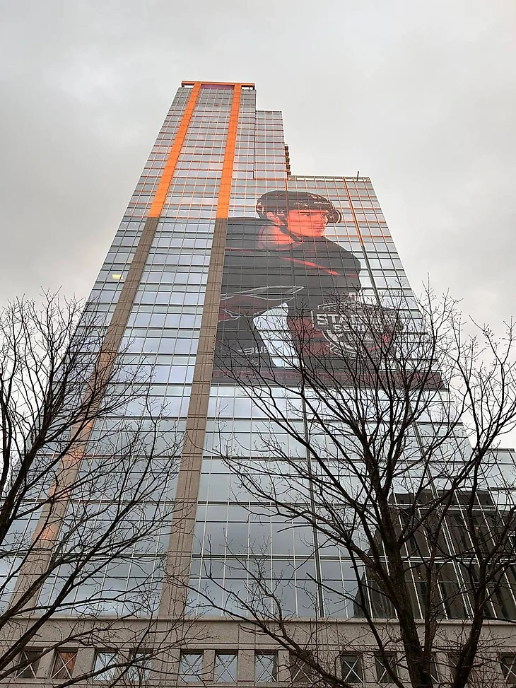Плакат с Андреем Свечниковым на крупнейшем небоскрёбе Роли "PNC Plaza"