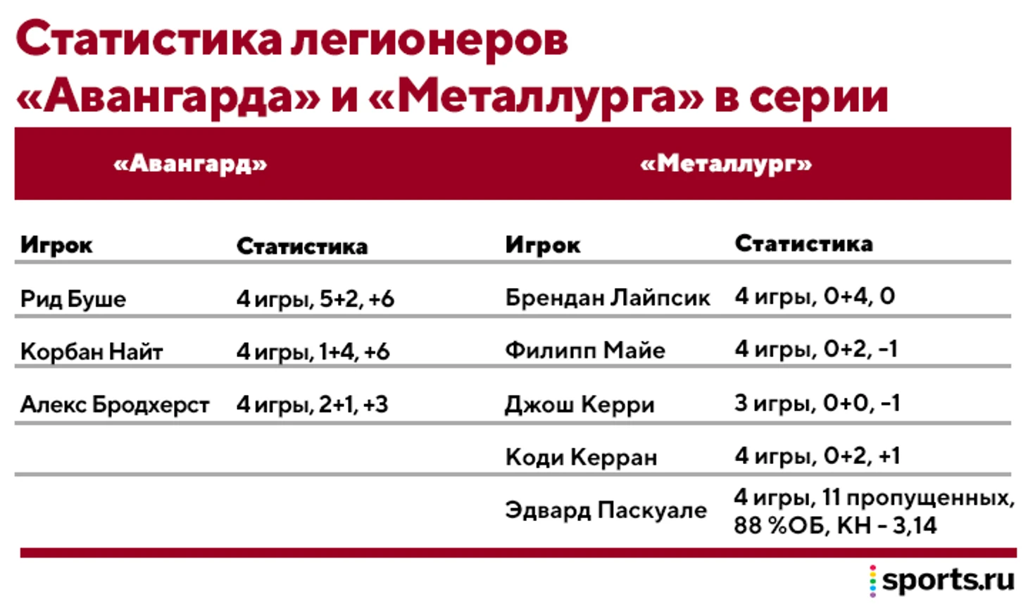 Еще один ключевой фактор серии – игра иностранцев. Этот сезон последний в лиге, когда команды задействуют по пять легионеров, поэтому сейчас их влияние на команды очень и очень велико. Хотя тот же «Авангард» доказывает, что и с тремя легионерами – Буше, Найтом и Бродхерстом (Сведберг – с казахстанским паспортом) – можно добиваться успеха.