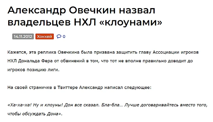 В принципе стороны ещё имели шанс договориться до старта «регулярки», но уступать в этом вопросе никто не хотел, потому 4 октября 2012-го лига отменила стартовую часть чемпионата, убрав из календаря 82 игры. Потепление наступило 16 октября, когда НХЛ предложила поделить доходы 50 на 50, не сокращать текущие контракты и начать сезон 2 ноября. Однако профсоюз сказал своё твердое «нет», после чего матчи отменились уже до 30 ноября. 25 октября в ситуацию вдаже мешивается тогдашний президент США Барак Обама. Он призвал стороны договориться побыстрее и не оставлять американских болельщиков без хоккея. Однако к середине ноября 2012 года обстановка между НХЛ и Профсоюзом игроков накалилась до предела. После того, как исполнительный директор Ассоциации игроков Дональд Фер ответил отказом на предложенные лигой условия, переговоры на целую неделю зашли в тупик. Проще говоря, переговоров не было совсем, даже по телефону, не говоря уже об официальных встречах двух сторон. Многие хоккейные специалисты уже тогда предполагали, что такая пауза и затишье – верные признаки того, что сезон и вовсе не будет сыгран. Тишину прервала Лига, которая в открытую обвинила профсоюз в том, что они вводят игроков в заблуждение. Якобы Фер и компания не до конца и не совсем точно доводят предложенные условия организации до хоккеистов. Игроки в ответ молчать не стали и дружно отправились в соцсети, где поделились с аудиторией своими мыслями по поводу сложившейся ситуации. Особенно отличился Александр Овечкин, который назвал владельцев клоунами и призвал тех скорее подписывать соглашение и поменьше рассказывать о том, что Дональд Фер делает что-то не так.