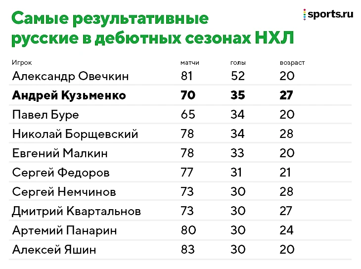 При этом в рейтинге самых голевых русских дебютов НХЛ есть персонажи и постарше, а сам Кузьменко уступает по голам лишь Овечкину, но уже, конечно, его не догонит.