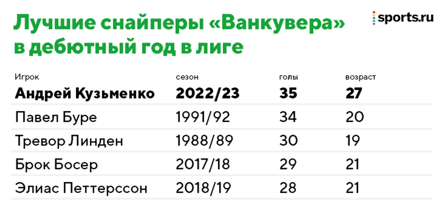 Она стала 35-й в сезоне – и по этому показателю он обошел даже клубное достижение Павла Буре: тот в свой первый сезон НХЛ забил за «Ванкувер» 34 гола. Есть правда один нюанс: «Русской ракете» тогда было всего 20. Да и остальные дебютанты лиги в клубном рейтинге помладше Кузьменко, который из-за возраста даже не претендует на «Колдер».