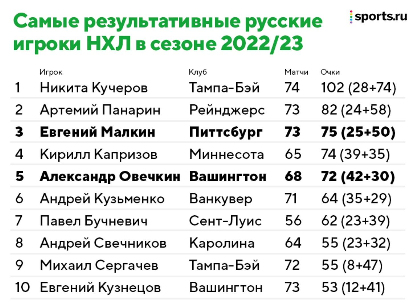 Но знаете, что самое крутое? Овечкину – 37, Малкину – 36, но они все еще в шикарной форме. Мы уже как-то отмечали, что они единственные в этом сезоне, кто в свои годы набирает больше очка за игру. А среди русских в текущей регулярке они не просто в топ-5 – эта пятерка прилично отрывается от остальных.