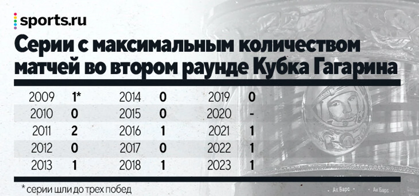 Одна из четырех серий затянулась по-максимуму – хотелось бы больше, конечно. Но, в целом, это абсолютно нормальный результат для лиги: за всю историю только однажды во втором раунде было два семиматчевых противостояния – в 2011-м «Авангард» Сумманена (в седьмом матче – Никитина) закусился с «Магниткой», а СКА – с «Атлантом». А шесть сезонов вообще прошли без седьмых матчей в полуфиналах конференций.