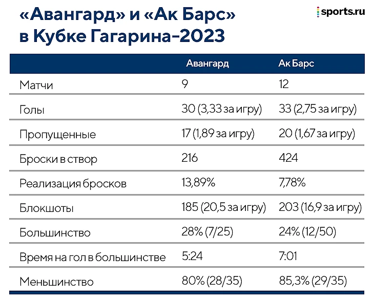 Из того, что бросается в глаза – количество бросков их точность. «Авангард» имеет внушительные 13,89% реализации – команда забила 30 голов за 9 игр с 216 бросков. Это просто какой-то запредельный показатель! У Казани ситуация куда хуже – 7,78%, 33 гола за 12 матчей с 424 бросков. Больше «Ак Барса» не бросает никто в нынешнем плей-офф, но выхлопа от этого, как видим, не так много.