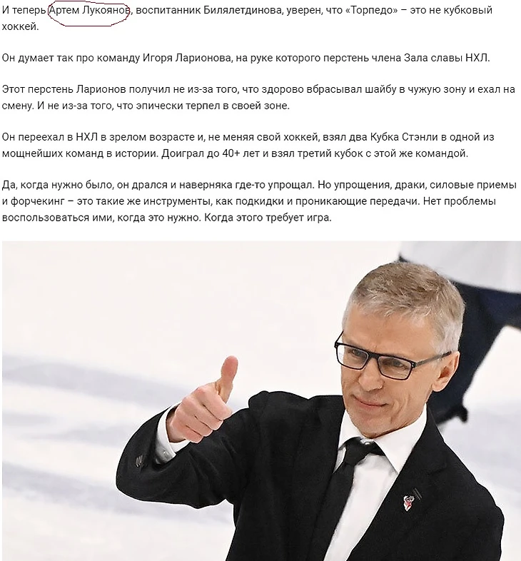 Его статьи «Торпедо» Ларионова – это возвращение здравого смысла. Напоминание о том, как вообще выглядит хоккей» и «Ларионов и менеджмент «Торпедо» доказали: в России есть игроки и они готовы побеждать весело» вышли с интервалом менее чем в две недели. Как болельщик «Ак Барс»а, ответственно заявляю: Н.П. поверхностно и безответственно подошёл к своей работе по нарезанию гифок, плюнув на мой гневный комментарий к более раннему посту.