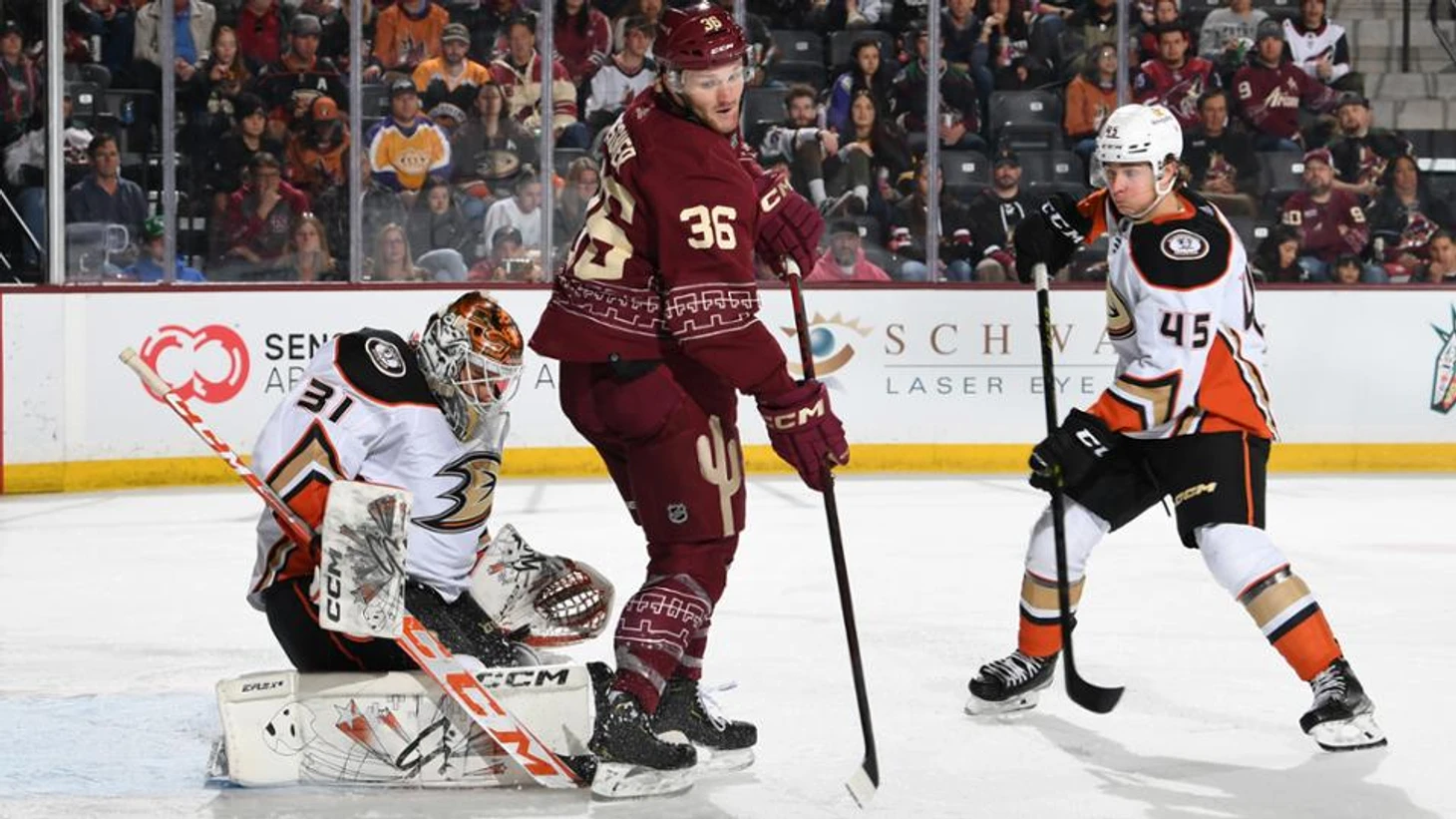 "Аризона Койотс"-"Анахайм Дакс" 5:4 (ОТ).Барретт Хэйтон в овертайме принёс победу хозяевам.Клейтон Келлер и Матиас Маккелли набрали по 2 очка (1+1),Николай Шмальтц и Янис Мозер отдали по 2 результативные передачи,Иван Просветов отразил 25 бросков.У гостей Райан Стром набрал 3 очка (1+2),Адам Энрике забросил 2 шайбы,Макс Джонс набрал 2 очка (1+1),Дерек Грант отдал 2 результатвные передачи.Во втором периоде Коннор Маки подрался с Райаном Стромом."Койоты" прервали серию из 9 поражений подряд.