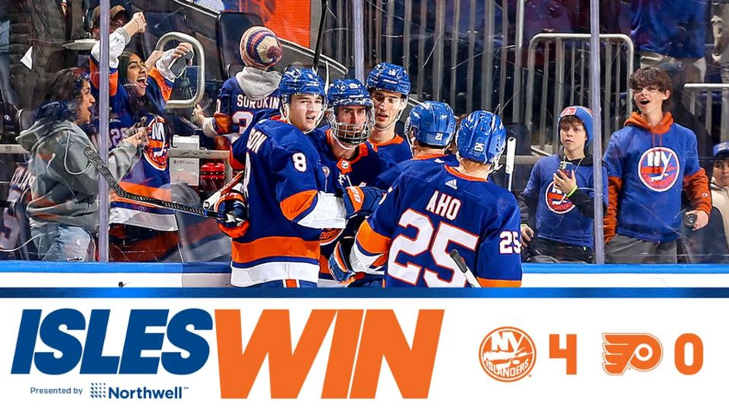 "Нью-Йорк Айлендерс"-"Филадельфия Флайерс" 4:0.Симон Холмстрём с Бо Хорватом и Ноа Добсоном отдали по 2 результативные передачи,Илья Сорокин отразил 27 бросков и сыграл 6 сухую игру в сезоне.