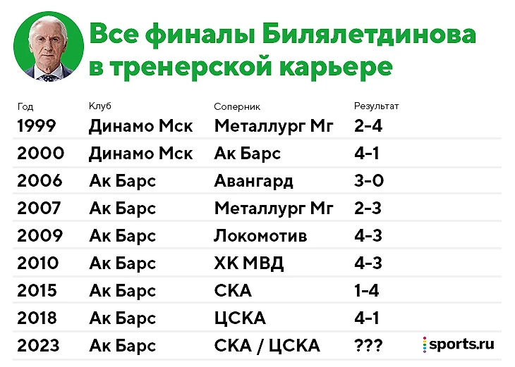 Предполагалось, что «Ак Барс» ждут проблемы после тяжелой серии с «Адмиралом» и двух выездов на Дальний Восток, но в финале конференции он всего за пять матчей расправился с «Авангардом». И для Казани предстоящий финал с ЦСКА или СКА (они свою серию еще продолжают) станет уже пятым в истории КХЛ. И все – с Билялетдиновым! То есть с учетом суперлиги тренер будет в финале 9-й раз за карьеру.