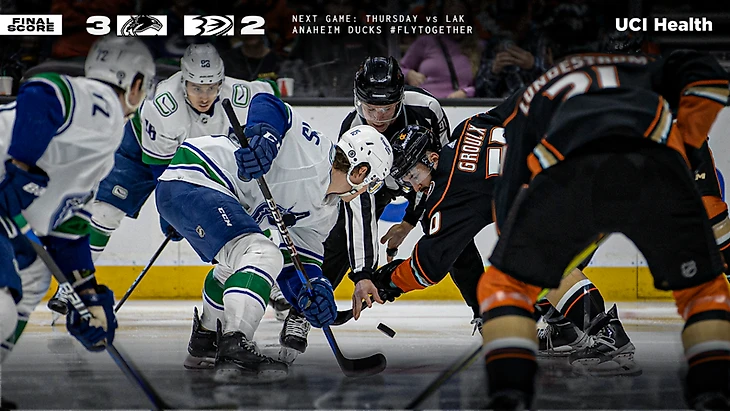 "Анахайм Дакс"-"Ванкувер Кэнакс" 2:3.Джей-Ти Миллер в начале третьего периода забросил победную шайбу.Джей-Ти Миллер набрал 2 очка (1+1),Элиас Петтерссон отдал 2 результативные передачи,Андрей Кузьменко забросил одну шайбу,Тэтчер Демко отразил 33 броска.У хозяев Тревор Зеграс отдал 2 результативные передачи.