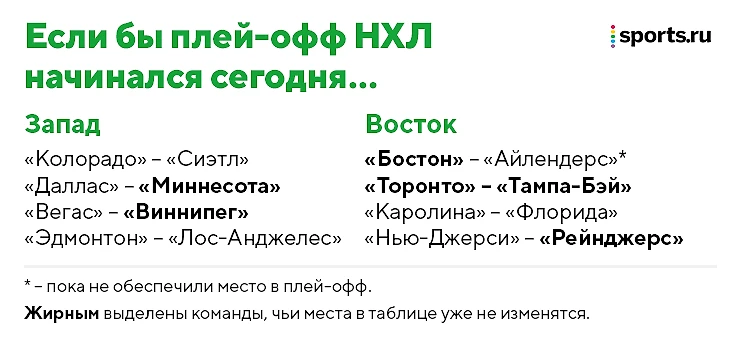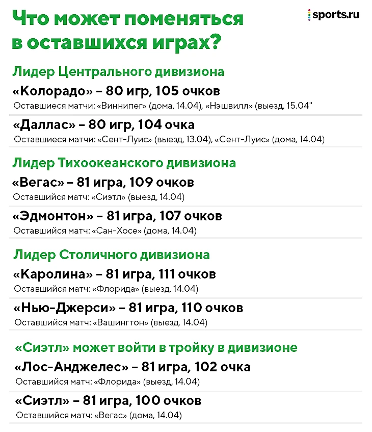 Но в остальном будет очень интересно, потому что поменяться может очень многое. Только в Атлантическом дивизионе первая тройка уже устаканилась, в Столичном и Центральном по-прежнему идет борьба за лидерство, а в Тихоокеанском в тройку еще может запрыгнуть «Сиэтл». При этом на Востоке могут поменяться местами «Флорида» и «Айлендерс», и не забываем, что еще минимальный шанс сохраняет «Питтсбург».