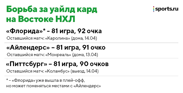 С поражением «пингвинов» путевку в Кубок Стэнли получила «Флорида». Впрочем, у нее есть и своя мотивация на последний матч с «Каролиной». «Пантерам» нельзя позволить обойти себя «Айлендерс», чтобы не попасть на «Бостон» в первом раунде.
