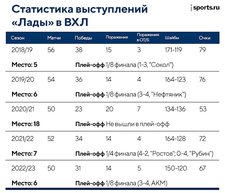 Лучшим достижением «Лады» стал четвертьфинал в прошлом году. В остальных сезонах команда либо вылетала в первом раунде, либо вовсе не выходила в плей-офф (как в сезоне-2020/21).