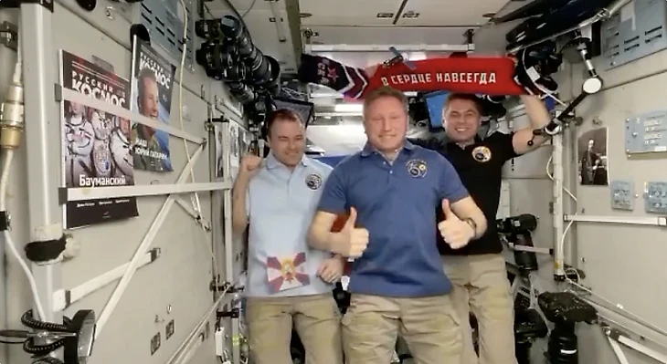 Российские космонавты-испытатели Сергей Прокопьев, Дмитрий Петелин и Андрей Федяев, находящиеся сейчас на борту Международной космической станции, записали видеообращение в адрес хоккейного клуба ЦСКА в преддверии финала Кубка Гагарина.