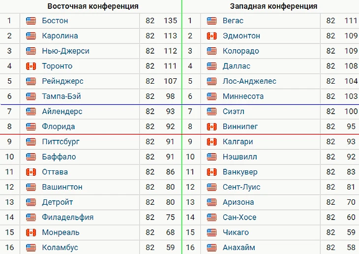 От Востока: «Бостон», «Каролина», «Нью-Джерси», «Торонто», «Рейнджерс», «Тампа-Бэй» «Айлендерс», «Флорида».