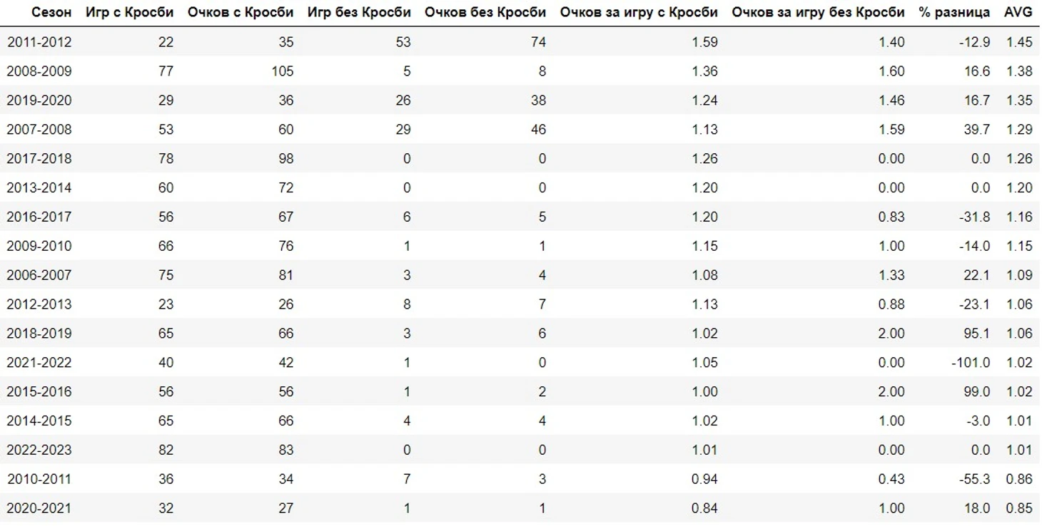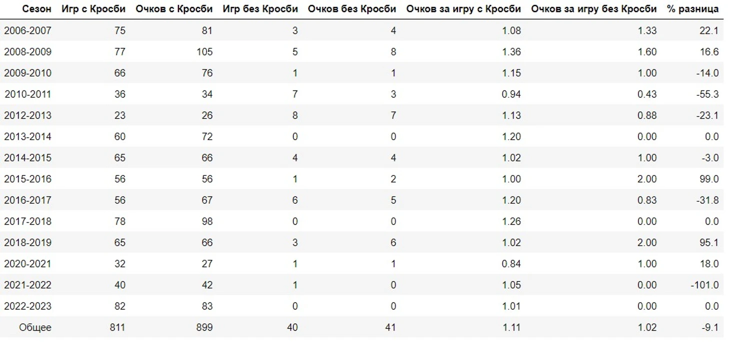 2) % разница - разница в среднем количестве очков за игру без Кросби от среднего количества очков с Кросби в составе. 0 в данной графе значит, что Малкин не выходил на лед в этом сезоне без Сидни в составе. Отрицательные значения говорят о том, что Малкин набирал больше очков с Кросби в составе, чем без него