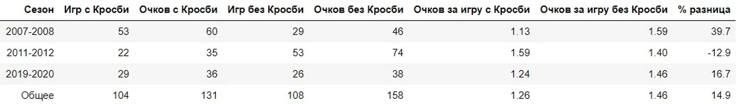 Из представленной информации можно сделать вывод, что Малкину сложнее набирать очки в играх без Кросби, но это не значит, что он играет неэффективно. В сезонах, где Малкин проводил менее 8 игр без Сида, он набирал в среднем на 9,1% меньше очков за игру. Однако, количество очков, набранных Малкиным в играх без Кросби, в целом соотносится с его общим количеством очков.