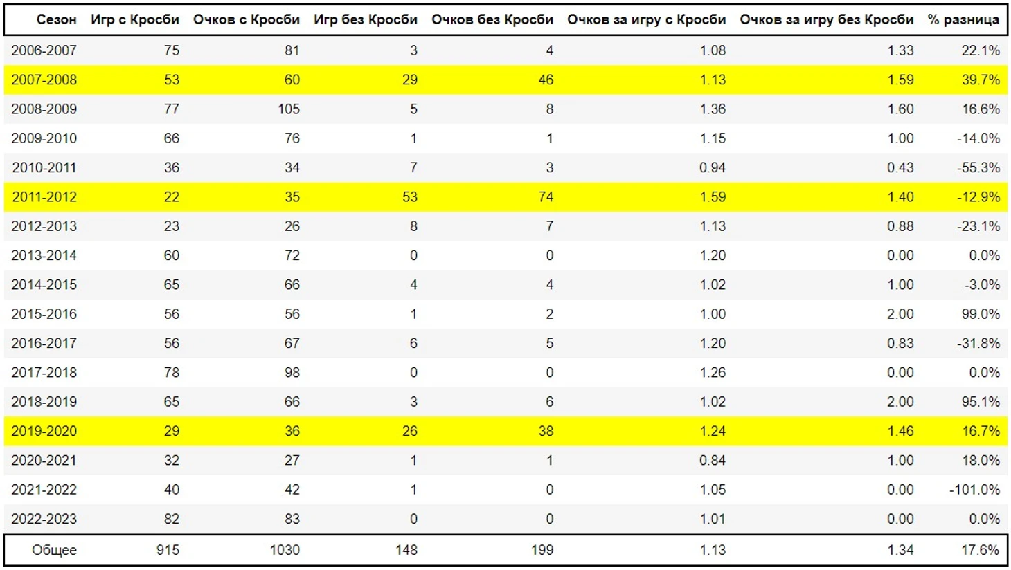 1) Те самые 3 сезона, когда Малкин играл без Кросби более 8 игр, входят в топ-4 лучших сезона по результативности в карьере Евгения