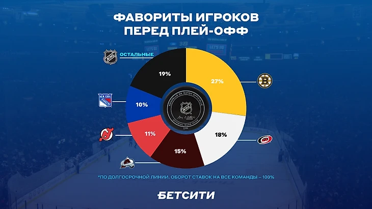 Фаворитами в борьбе за чемпионство игроки БЕТСИТИ видят «Бостон». На победу «Брюинз» по долгосрочной линии пришлись 27% ставок. У их ближайшего преследователя — «Каролины» — 18%. В тройку фаворитов наших игроков также попал «Колорадо» — 15%.