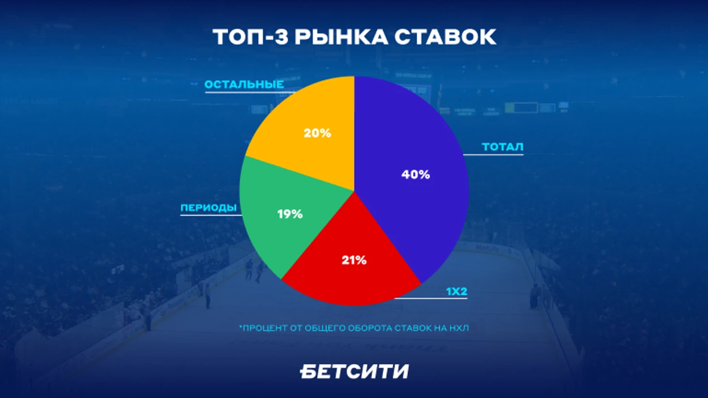 Самый популярный рынок ставок на НХЛ — тоталы. На тоталы больше и меньше пришлись 40% ставок. На основные исходы — 1х2 — ставили еще 21% игроков. Делать ставки на события в периодах предпочли 19% клиентов БЕТСИТИ.
