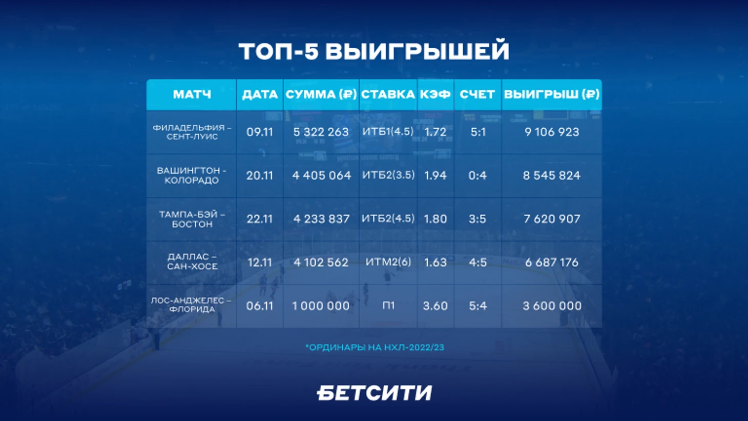 В компании рассказали о самых крупных выигрышах игроков. Возглавил список выигрыш с матча «Филадельфия» — «Сент-Луис». Игрок поставил 5 322 263 рубля на то, что «Флайерз» забросят пять и более шайб. Коэффициент составил 1.72. Гол нападающего Оуэна Типпетта за 40 секунд до сирены сделал счет 5:1 в пользу хозяев и принес игроку БЕТСИТИ огромный выигрыш — 9 106 923 рубля.