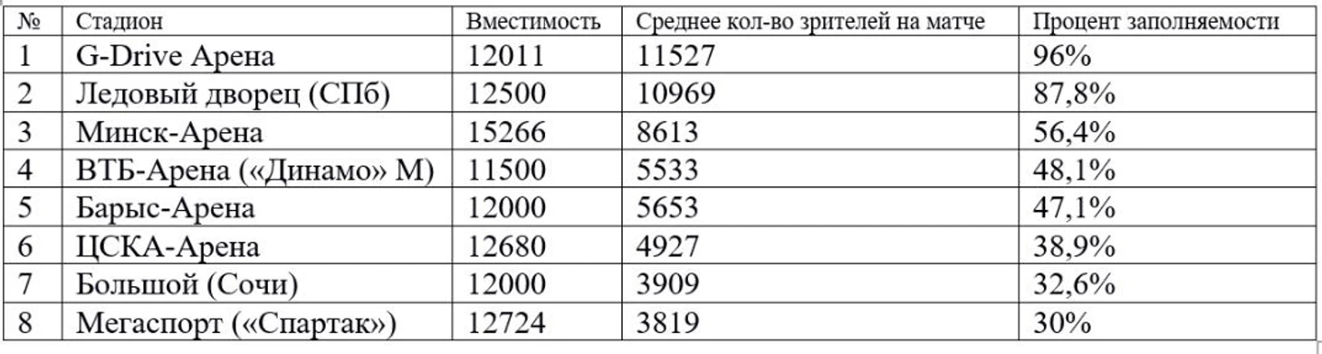 Средняя заполняемость самых больших стадионов КХЛ (вместимостью 10 тыс. зрителей и более) в сезоне-2022/2023