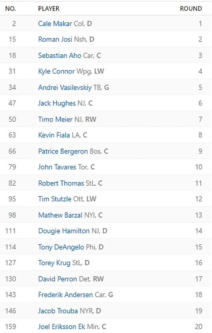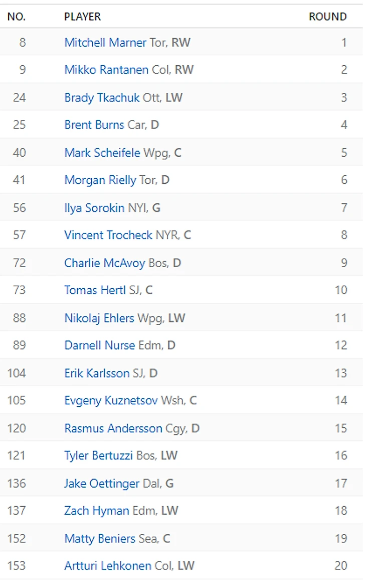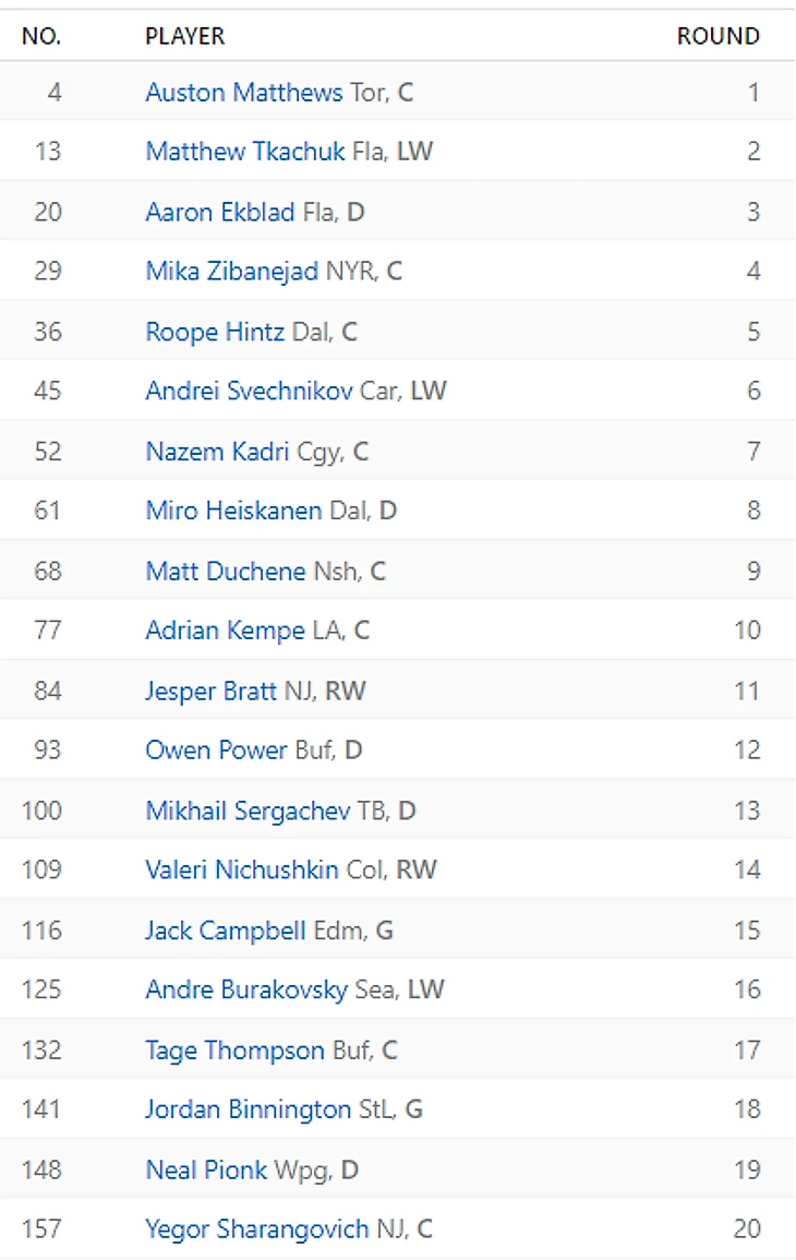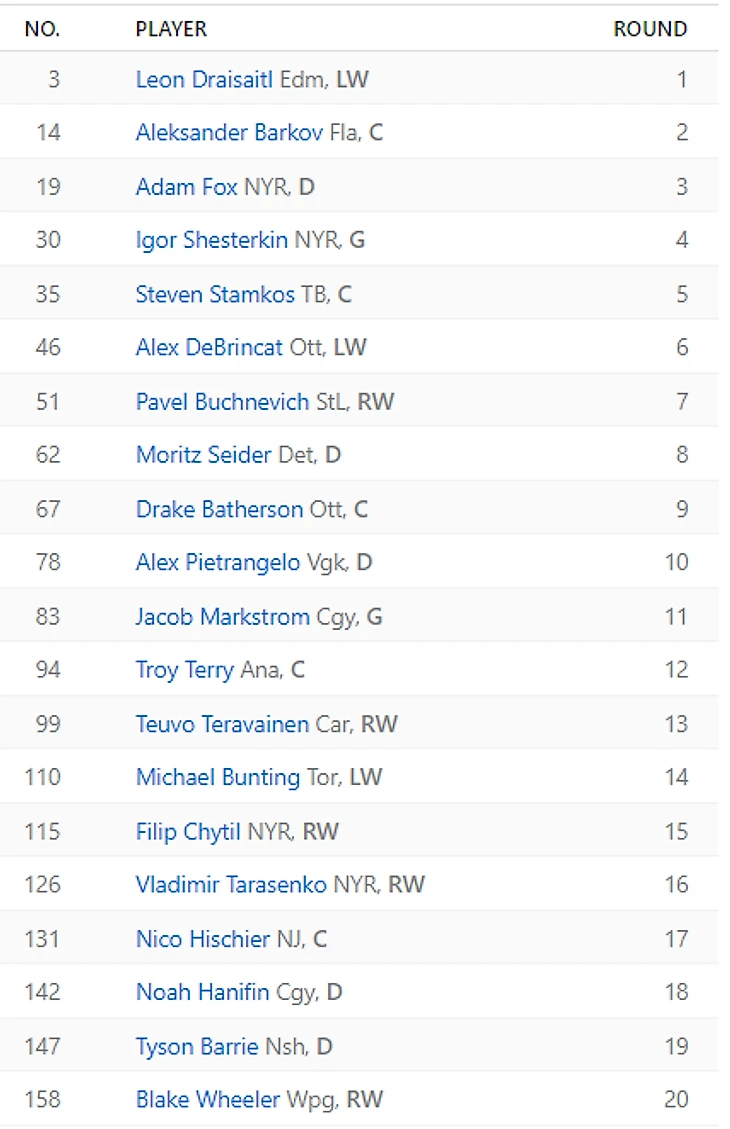 Разочарования: Виктор Хедман (29.1), гаврики из Калгари: Уигар (27.9), Линдхолм (27.2). Витя первую половину сезона не выходил на связь, пока какая-то возможность удержаться в верхней части таблицы была. Элиас довольно рано уехал на повышение за гайками, а Уигар только в конце сезона сделал вид, что ему не плевать на фентезистов.
