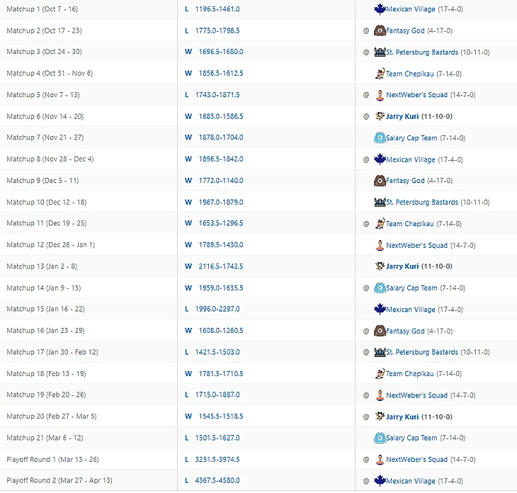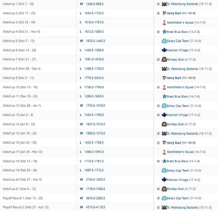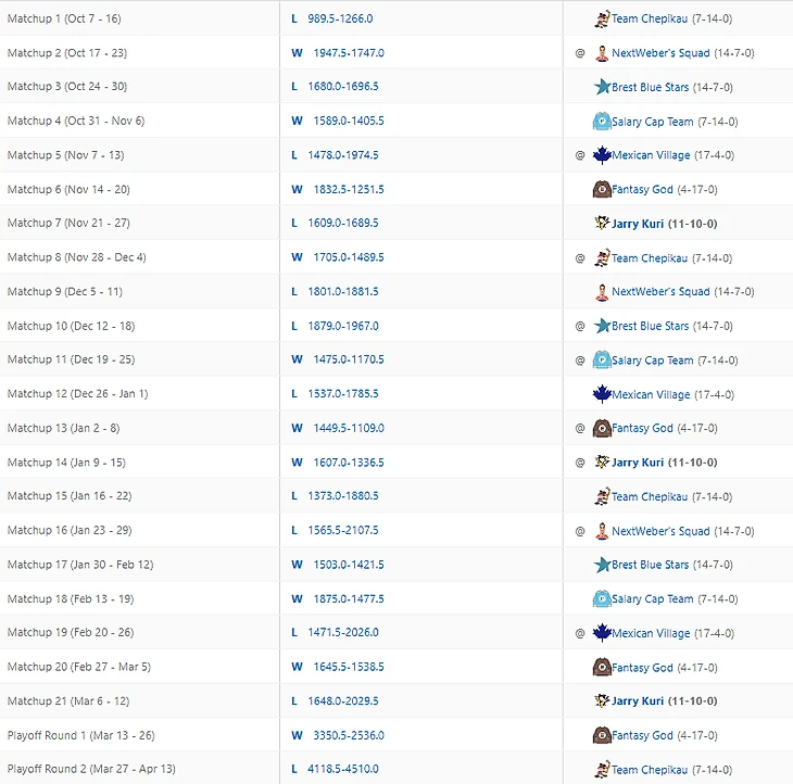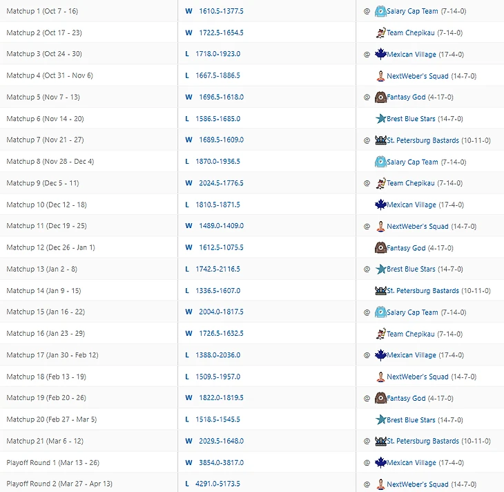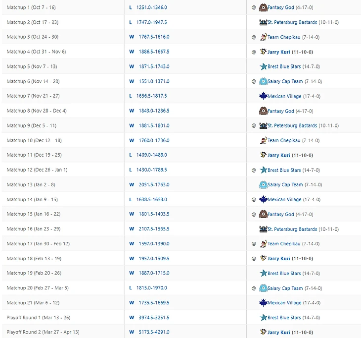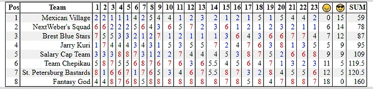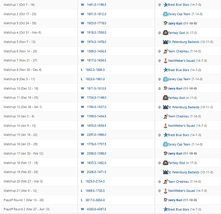Уже скоро месяц, как завершился сезон фентези, а коммиш не родил обещанных постов. Первой заслужила итоговый обзор лига, имеющий самый медийный состав игроков. Два комментатора 36 студии, лидеры мнений с суммарной аудиторией в 9450 человек, аналитики из таких хоккейных стран, как Дания и Австрия, дембель айти-роты. Всё это Сухарян лига. Настройки и скоринг с хет-триками и шатаутами смотреть на ESPN. Ввиду относительно небольшого состава участников лиги и размера состава, все хорошие игроки не влазят в состав. Для полевых игроков норма набора фентези-очков, чтобы не вылетать на вейвер - 26-32. Топари набирают больше. Но для большего погружения желательно покликать настройки лиги, вейвер и составы.