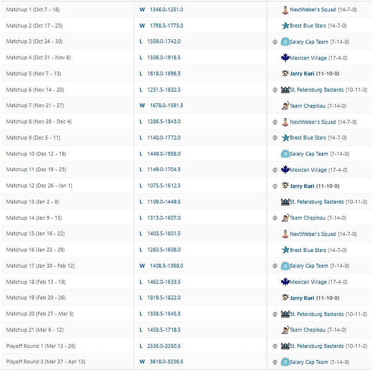 Разочарования: чокеры из пенсильванской птицефабрики (31.0 Сид, 30.3 Летанг, 29.1 Генцел, 33.1 Джарри) Филипп "уже не 64" Форсберг (27.0), любимчик Петухова Енот (🙈). Первые, включившись в 21-22 матчапы, даже оправдали эффектный мув на драфте, но послевкусие с белковой ноткой получилось. Поискать новый магазин для покупки мяса в межсезонье, что ли. По поводу остальных: вейвер, спасибо что ты есть. Эти слова да Брисбуа в уши.