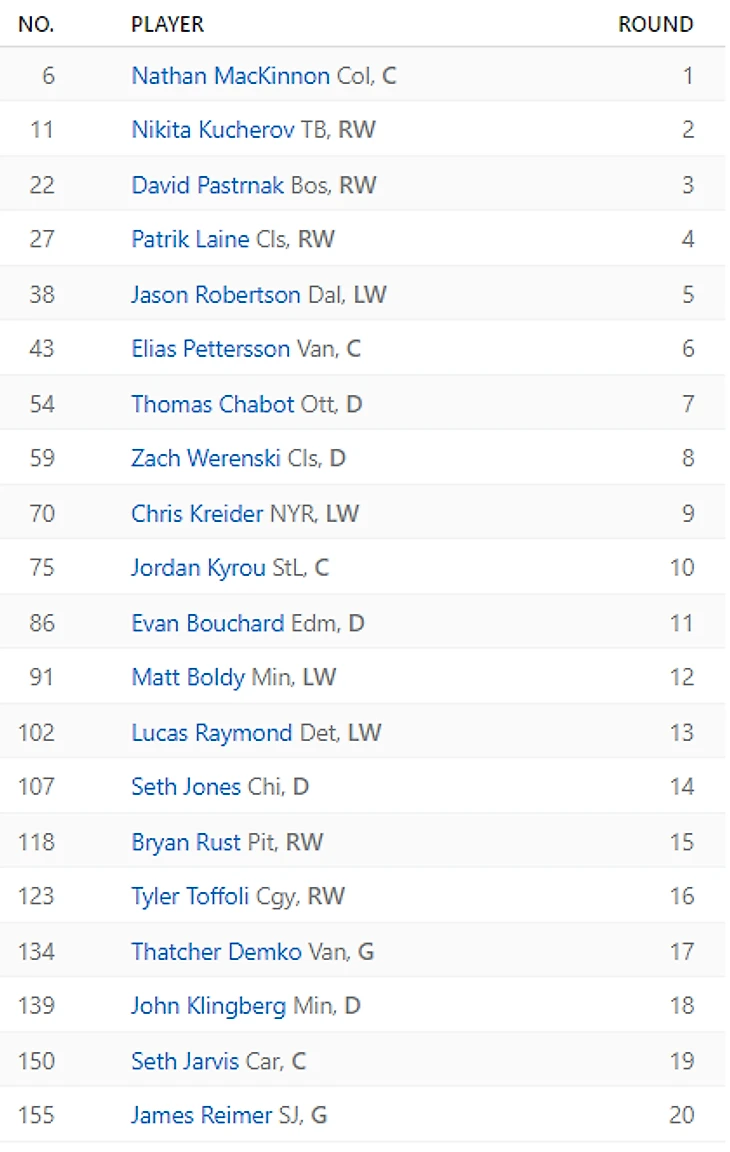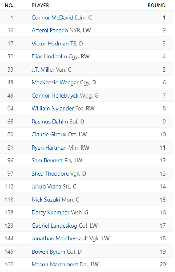Попадания: Расмус Далин (36.1), Коннор Макдэвид (44.3). Коннор в очередной раз напоминает, зачем нужно помнить схему распределения процентов на лотерею драфта. Ещё бы делал хет-трики по заказу в личке одноклассников. Далин своим уровнем заслуживает, чтобы его именем называли команды, но здесь уже место занято. Когда там контрактный год?