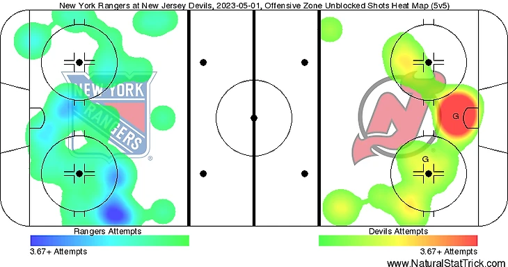 Следующее меньшинство в матче «Дэвилс» руками Палата превратили в гол – больше шансов у первой спецбригады и не было. Импульса команда не получила, и зацепиться ей было практически не за что – в равных составах «Нью-Джерси» был страшен. Смотрим итоговые цифры при 5-на-5: опасные моменты 5-17 в пользу «дьяволов». И они не разменивались на неопасные броски, они метили четко на чужой пятак – посмотрите карту бросков, там вообще ничего лишнего, только жара на пятаке Шестеркина.