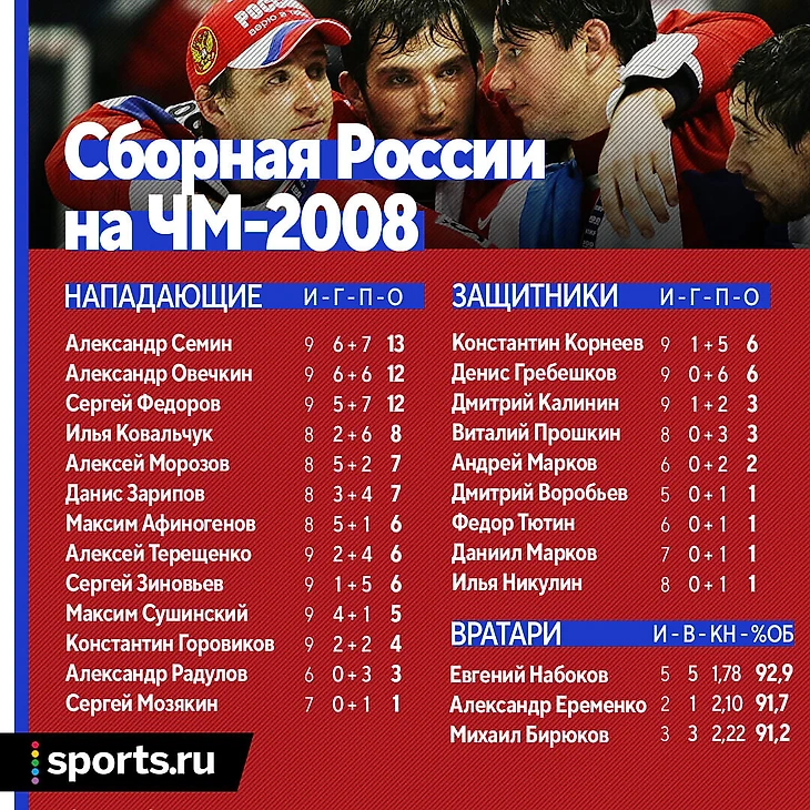 В итоге приехал даже Сергей Федоров, не игравший на чемпионатах мира с 1990 года. А вот вратарь «Финикса» Илья Брызгалов по «причинам личного характера» не появился, и основным снова стал Александр Еременко, чья ошибка привела к поражению в полуфинале ЧМ-2007.