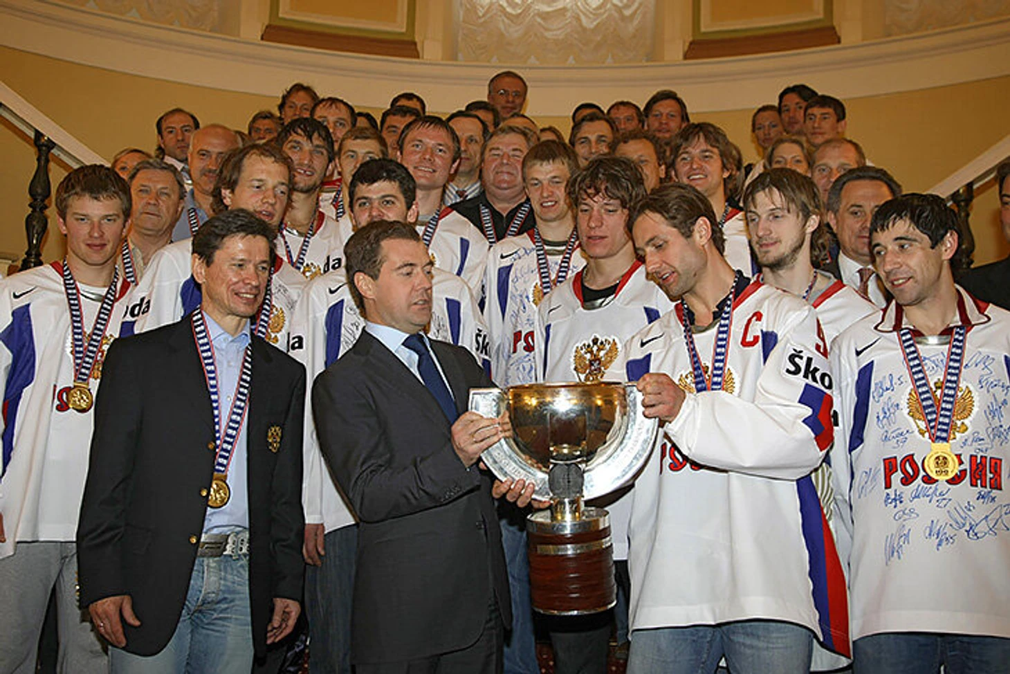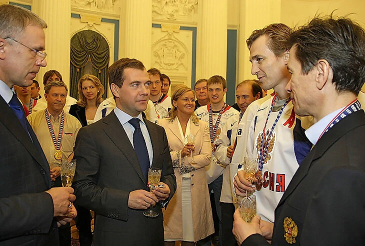 После официальной части принесли шампанское, стали общаться с Медведевым в тесном кругу. Но я не считал, что сделал такой уж большой вклад в победу на чемпионате мира, поэтому держался с женой и шестилетним сыном чуть в сторонке.