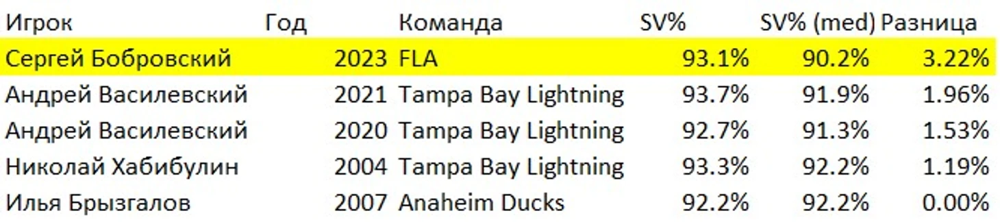При сравнении медианы и среднего меняются только первые два места: Василевский 2021 и Сергей Бобровский