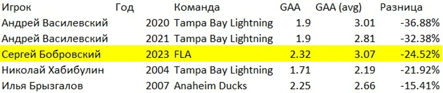 Места никак не меняются при переходе от метрике к метрике. Первые места занимают оба чемпионских сезона Андрея Василевского. Последний снова - Илья Брызгалов