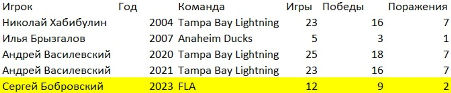 Три российских вратаря брали Кубок Стенли - Николай Хабибулин, Илья Брызгалов и Андрей Василевский (2 раза). Николай и Андрей при этом взяли трофей за одну и ту же команду, а Брызгалов - единственный, кто выиграл Кубок Стенли в качестве бэкапа. Также в 2021 году Василевский взял еще и Конн Смайт Трофи