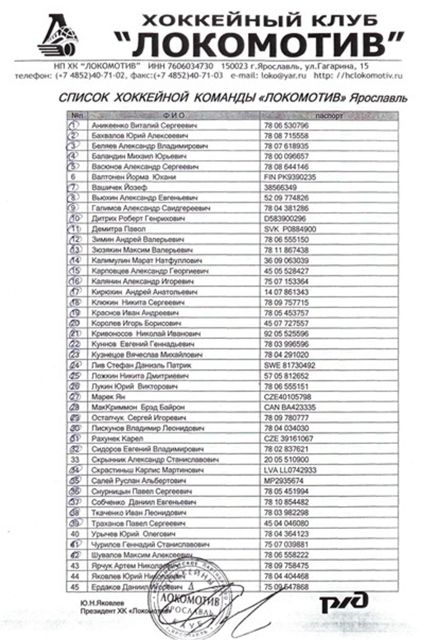 19.35. Хоккеисты Ердаков, Скрынник, Урычев, Ярчук, тренер Йорма Валтонен как и президент клуба Лукин в этом списке не обведены ручкой. Значит ли это, что, как и Лукин, они не садились на самолет?