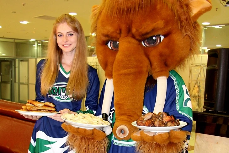По фотографии можно было бы подумать, что это иллюстрация стереотипа, согласно которому красивые девушки любят лишь брутальных волосатых мужчин. Но нет, очаровательная блондинка с мамонтом просто рекламируют новую питательно-сувенирную продукцию от хоккейного клуба «Югра». Вместе с торговой маркой «Биатлон» клуб начал выпуск продуктов питания: пельменей, вареников, зразов, шашлыков, блинчиков с мясом и вареной сгущенкой и других.