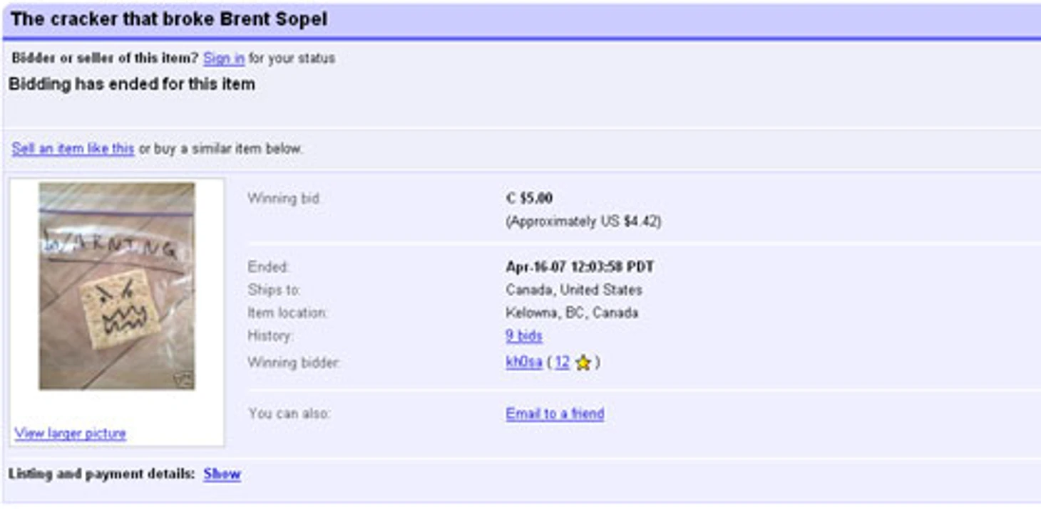 Защитник «Салавата Юлаева» пропустил первый матч первого раунда плей-офф НХЛ-2007 против «Далласа» из-за травмы спины. Ничего вроде бы нелепого, если бы он не получил эту травму, поднимая крекер, который уронила его дочь. Шуток было не меньше, чем с Пеннером, все точно так же отказывались верить, но Брент утверждал, что сей факт может подтвердить вся его семья, находившаяся в тот момент рядом с ним, и поверить пришлось. Через пару дней на аукционе Ebay появился лот «Крекер, сломавший Брента Сопела». Стартовая цена составляла 5 долларов, за которые он и ушел неизвестному покупателю. До сих пор неизвестно, тот ли это крекер.