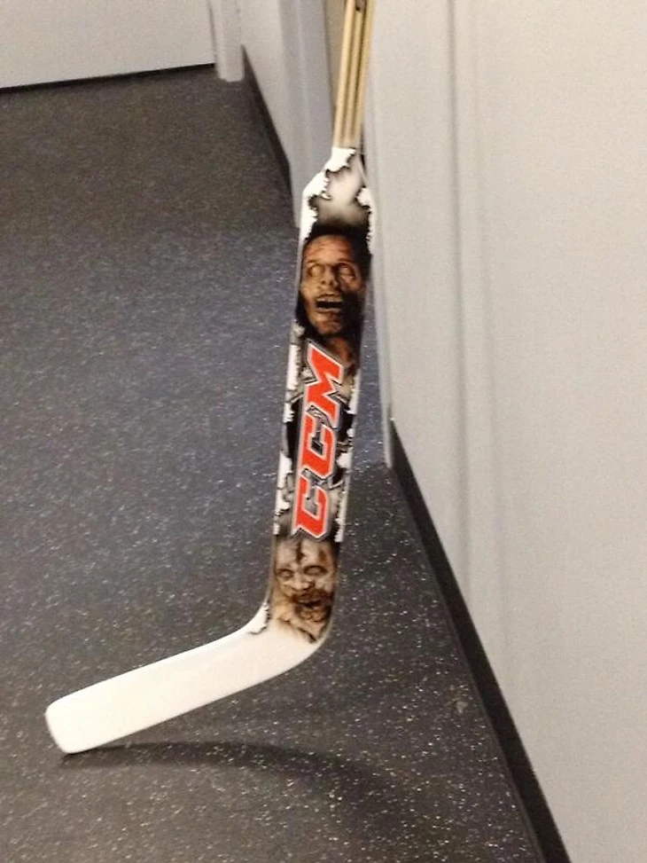 Стив Мэйсон таким оригинальным способом пытается отвадить соперников от ворот «Филадельфии». На его маске изображены зомби-версии Клода Жиру и Уэйда Симмондса, не менее эффектно смотрится и клюшка. Тем временем, в трех последних матчах вратари «Флайерс» пропустили 14 шайб. Что они придумают дальше? Поставят перед собой двухметровое чучело Криса Пронгера? Или, может, начнут выручать?